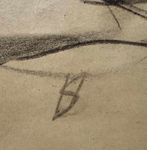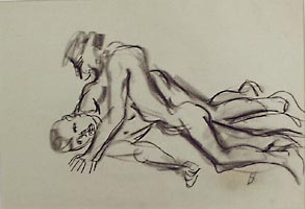 Expressive Kohlezeichnung eines Paares. Monogrammiert, zudem rückseitig Nachlass-Stempel. Blatt-Maße ca. 50x35 cm. Reste alter Montierungen (Klebestreifen), geringer Papierverlust an einer Ecke, kleiner Einriss im Randbereich - jeweils außerhalb der Darstellung. Wohl Ende der 20er Jahre (auf jeden Fall vor der Eheschließung mit E. Th. Holtz, danach sind die Arbeiten mit "HSH" monogrammiert).