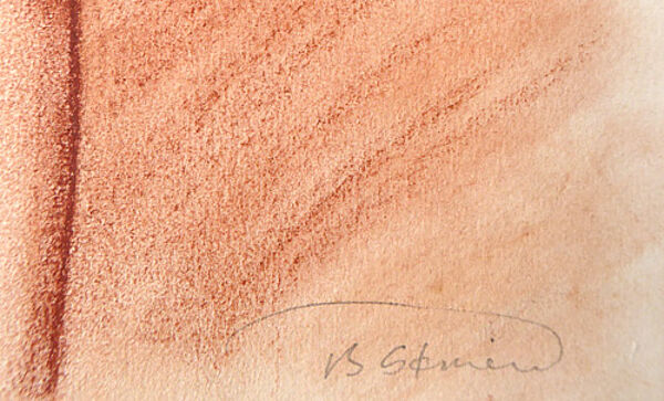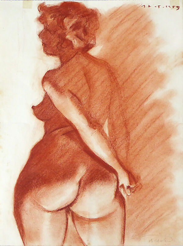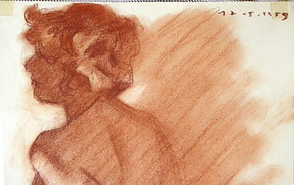 Rotbraune Kreide auf Papier, rechts unten mit Bleistift handsigniert, rechts oben datiert "17.5.19592, rückseitig Nachlassstempel. Blattmaße ca. 32 x 24 cm, das Papier hat eine zweimalige Faltung erfahren, am oberen Rand zwei Klebepfalze, ansonsten leichte Griff- und Altersspuren.