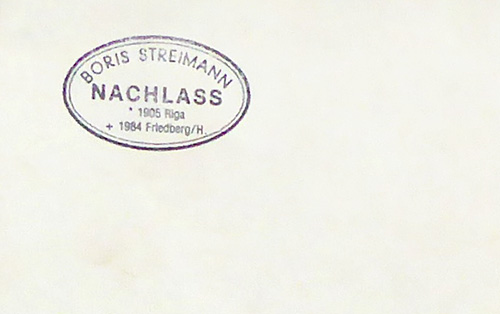 zu Boris Streimann (alias Boris Namir und Boris Bonamir): geboren 1908; Maler, Grafiker und Gebrauchsgrafiker; Begabtenstipendium für das Kunststudium in Berlin; in den 1920er und 30er Jahren hauptsächlich Arbeiten für den UFA-Werbedienst, aber auch für Hegewald-Film, Deutsche Fox A.G., Tobis und Bavaria; ab 1945 Filmplakate und Inserate für die Filmfirmen Union-Film, Deutsche London-Film, Eagle-Lion und J. Arthur Rank; Gestaltung von Buchumschlägen, Seifenreklame, Werbeplakaten für die Industrie; umfangreiches künstlerisches Werk mit Stillleben, Jagdmotiven und Portraits; verstorben am 1984 (Quelle: Kunsthandlung Pauer).