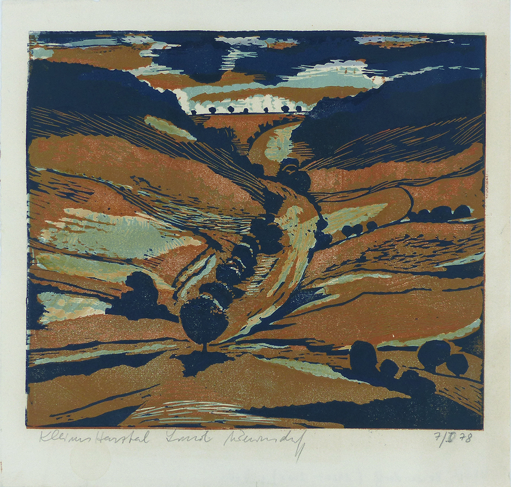 Farbiger Linolschnitt, mittig unter der Darstellung mit Bleistift handsigniert, links betitelt und bezeichnet “Linol”, rechts auflagenbezeichnet “7/20” (?) und datiert (19)"78”, Blattmaße ca.29 x 30 cm, geringe bis allenfalls moderate Alters-, Griff- und Lagerspuren.
