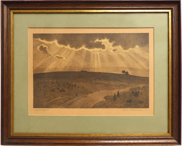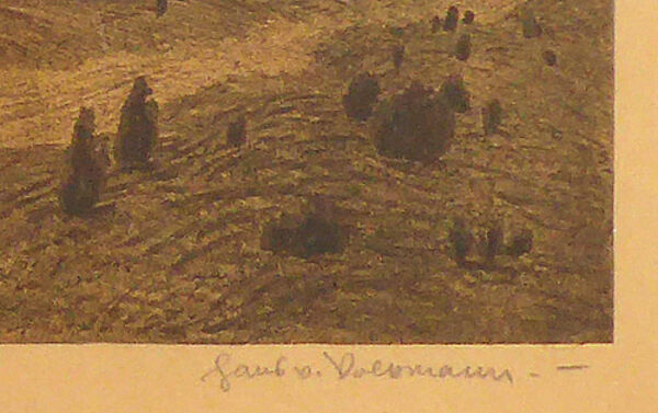 Lithografie auf chamois-tonigem Papier, hinter älterem, grau-grünen Passepartout, gerahmt mit einer ebenfalls älteren, gekehlten, braun gebeizten, innen schmal goldfarben abgesetzten Eichenleiste (nicht geöffnet). Unterhalb der Darstellung rechts mit Bleistift handsigniert, links bezeichnet. Bildmaße ca. 32,5 x 21 cm, Rahmenaußenmaße der ca. 50 x 40 cm. Geringe Altersspuren, Papier vermutlich etwas gebräunt. Wohl um 1900 bis 1920.