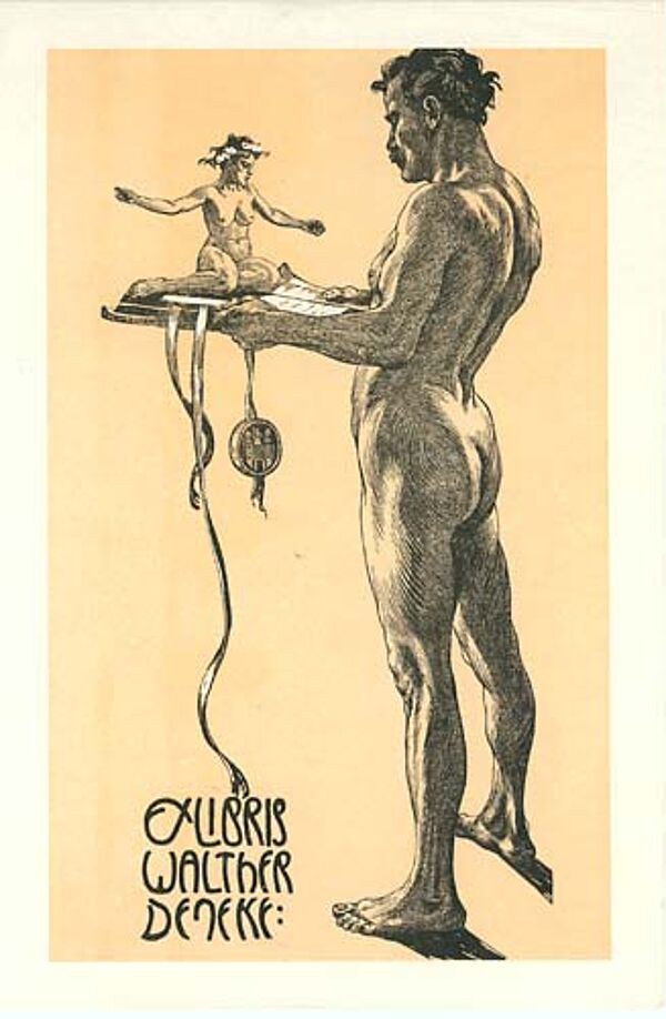 Lithografie (wohl nach einer Radierung) auf teilweise gelbtonigem Papier: Darstellung eines stehenden männlichen Aktes, der ein Tablett mit einem Buch und einem kleinen weiblichen Akt in den Händen hält. Bildmaße ca. 18,2 x 11 cm, Blattgröße ca. 20 x 13,3 cm. Rückseitig partiell Rest alter Montierung, moderate Gebrauchs- und Griffspuren. Wohl Deutschland um 1908 / 10.