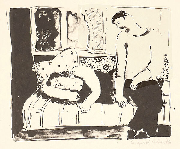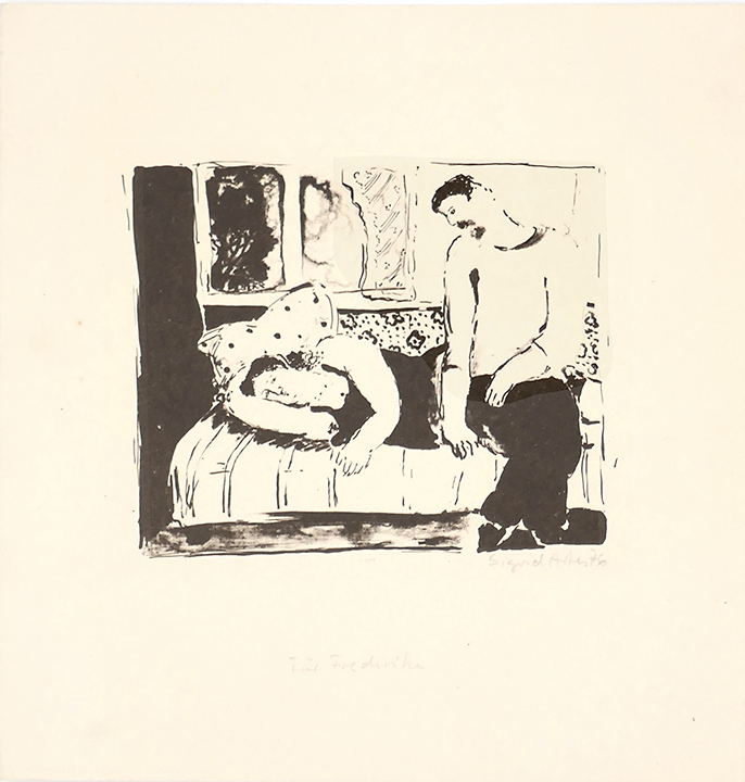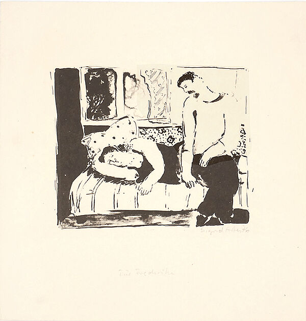Dunkelbrauntonige Lithografie, rechts unter der Darstellung mit Bleistift handsigniert und datiert (19)"76" sowie mittig bezeichnet “Für Friderike”, Bildmaße ca. 12 x 9,5 cm, Blattmaße ca. 19 x 18 cm, diskrete Alters-, Griff- und Lagerspuren.