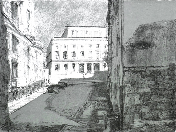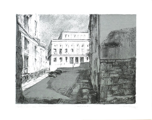 Lithografie auf Velin, rechts unter der Darstellung mit Bleistift handsigniert und datiert "2002", mittig bezeichnet "Probedruck", links betitelt. Blattmaße ca. 49,5 x 38,2 cm, Bildmaße ca. 42,5 x 31,5 cm, minimale Alters-, Griff- und Lagerspuren.