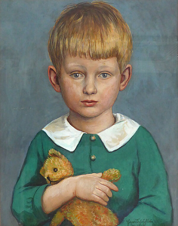Mischtechnik auf Karton: Bildnis eines Knaben mit Teddybär im Arm, en face dem Betrachter zugewandt (evtl. der Sohn des Künstlers). Unten rechts signiert und mit "Dezember 1924" datiert. Maße ca. 45 x 34,5 cm. Gerahmt in alter goldfarbener Leiste. Geringe Altersspuren.