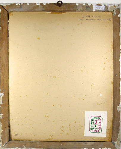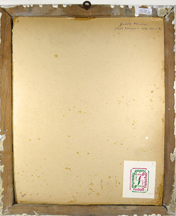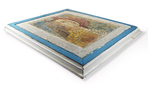 Farbige Mosaiksteine in Mörtel, mit originalem. zweigeteiltem Rahmen, wobei der äußere Teil hellblau gefasst ist. Verso Künstleraufkleber: "Rudolf Fleischer". Bildmaße ca. 28,5 x 20,5 cm, Rahmenaußenmaße ca. 42,5 x 35 cm, Rahmentiefe ca. 4,5 cm, geringe Altersspuren. Wohl 1940er bis 60er Jahre.