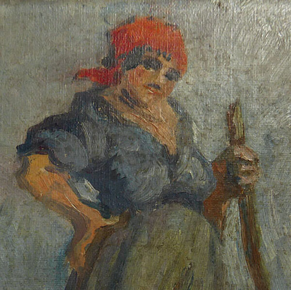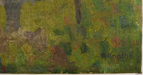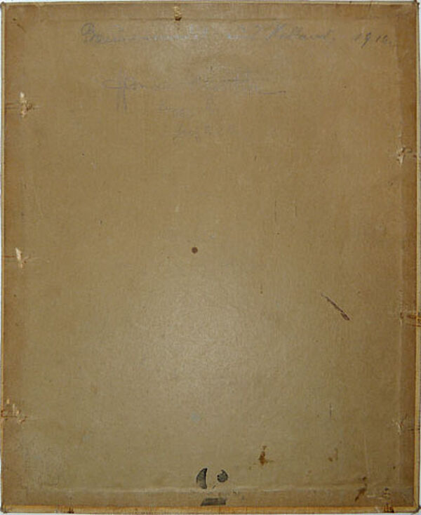 Öl auf Leinwand, diese auf Karton kaschiert. Rechts unten signiert, rückseitig handschriftlich mit Bleistift - wohl vom Künstler - betitelt und datiert "1916" sowie nochmals signiert. Bildmaße ca. 27 x 22 cm, ungereinigter Zustand mit leichten Verschmutzungs- und Altersspuren.
