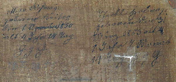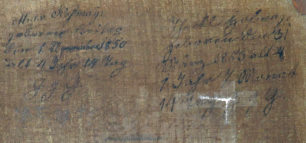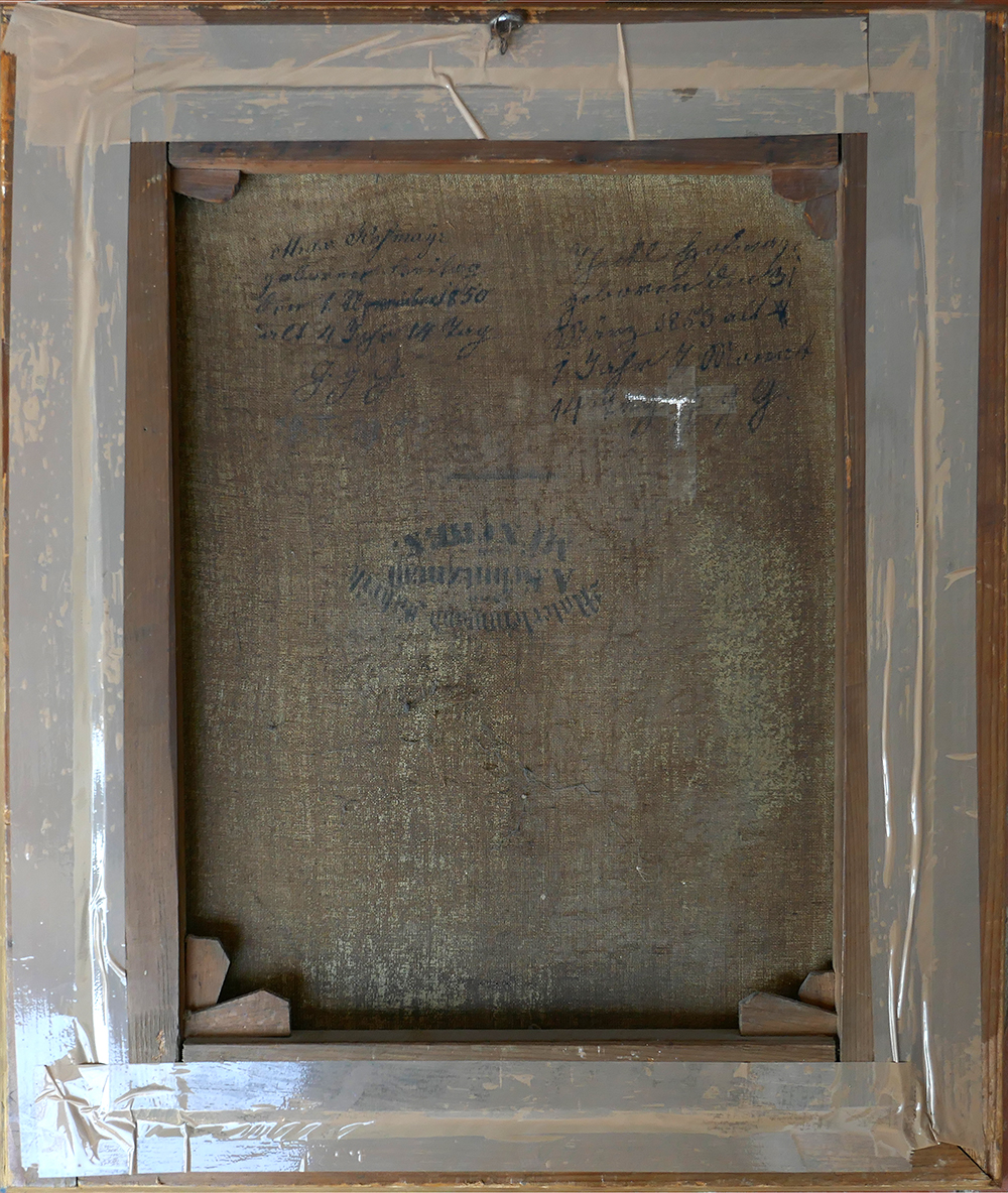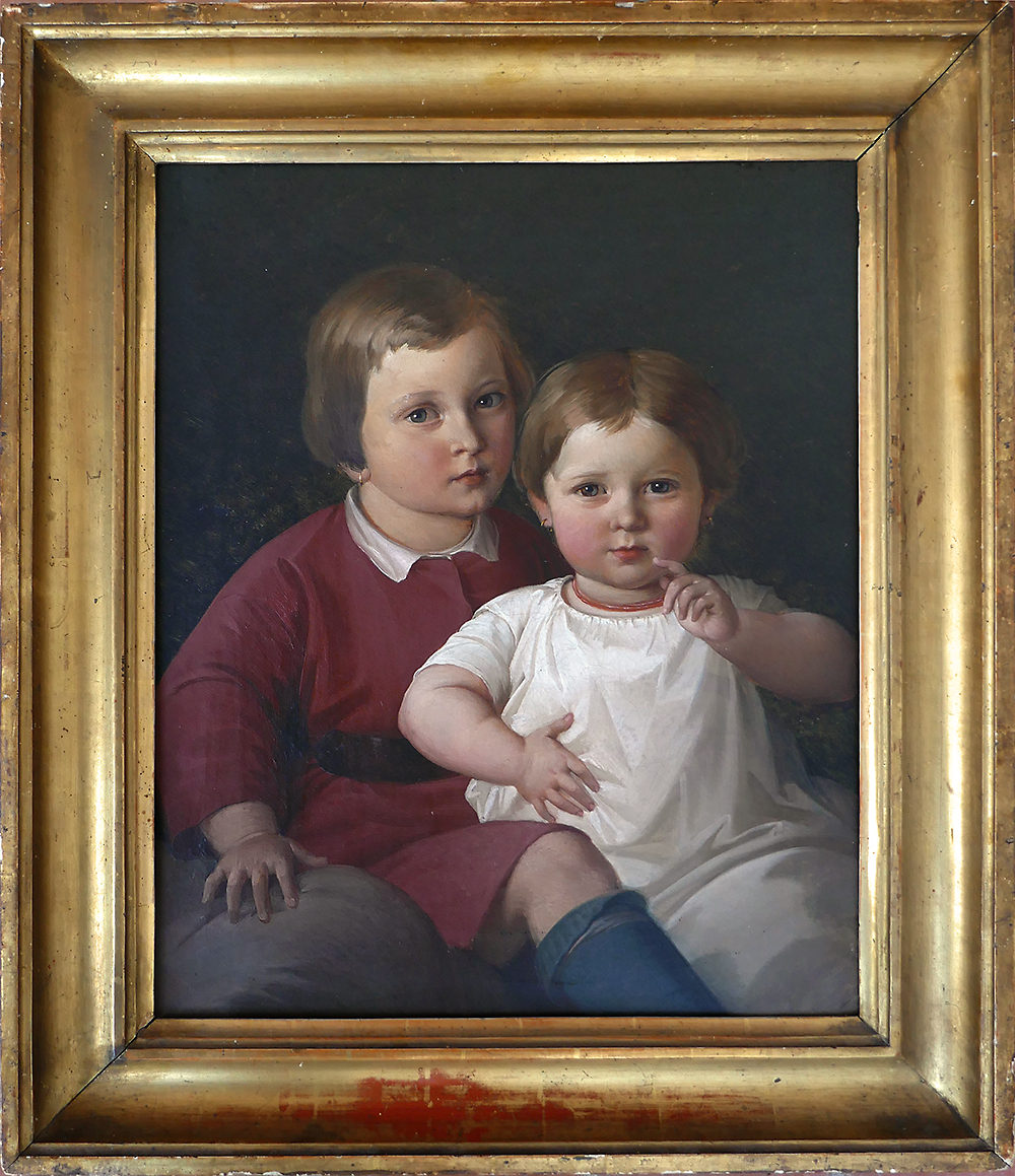 Öl auf Leinwand, dargestellt ist ein sitzendes Geschwisterpaar in zeittypischer Kleidung, unsigniert, rückseitig mehrfach bezeichnet "Max Hofmayr, geboren am Freitag den 1. November 1850, alt 4 Jahr ...Hofmayr, geboren am 31.März 1855, alt 1 Jahr 7 Monat, 14.....", Stempel "Malerleinwand". Maße ca. 42 x 34 cm, profilierte Holzleiste mit Polimentvergoldung ca. 56 x 47 cm. Es zeigen sich moderate Altersspuren, insbesondere Craquelé, kleinere Retuschen, minimale Löcher in der Leinwand, der Rahmen ist leicht berieben und partiell leicht bestoßen. Wohl Ende der 1850er Jahre.