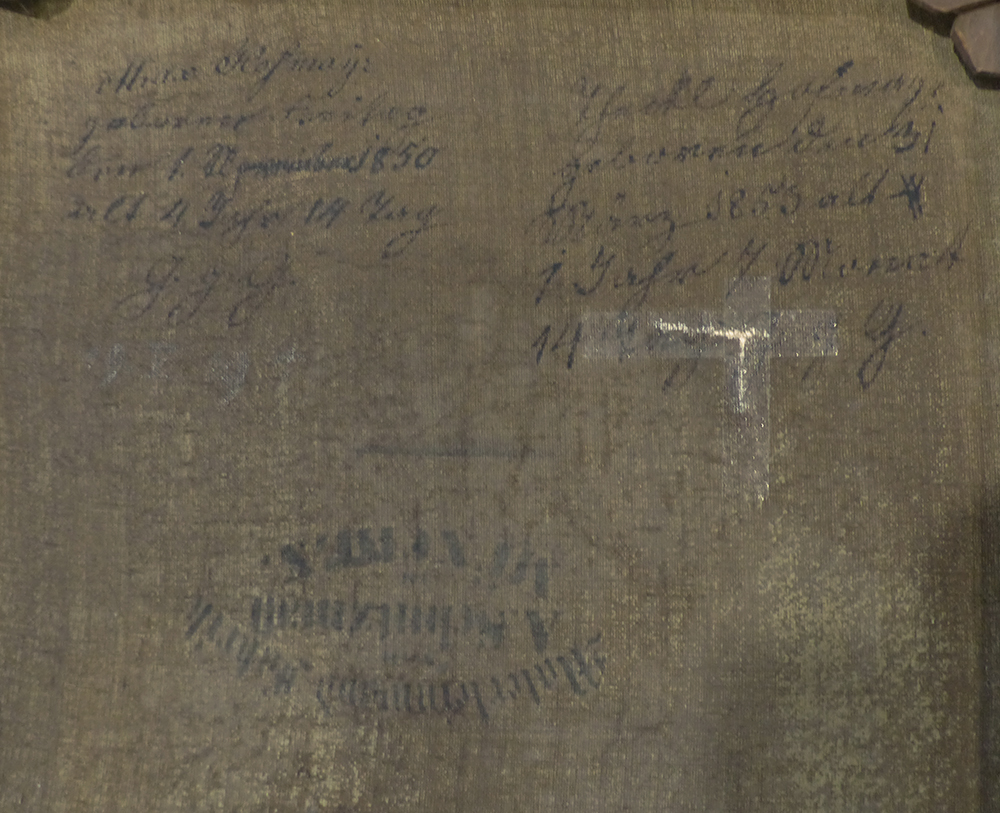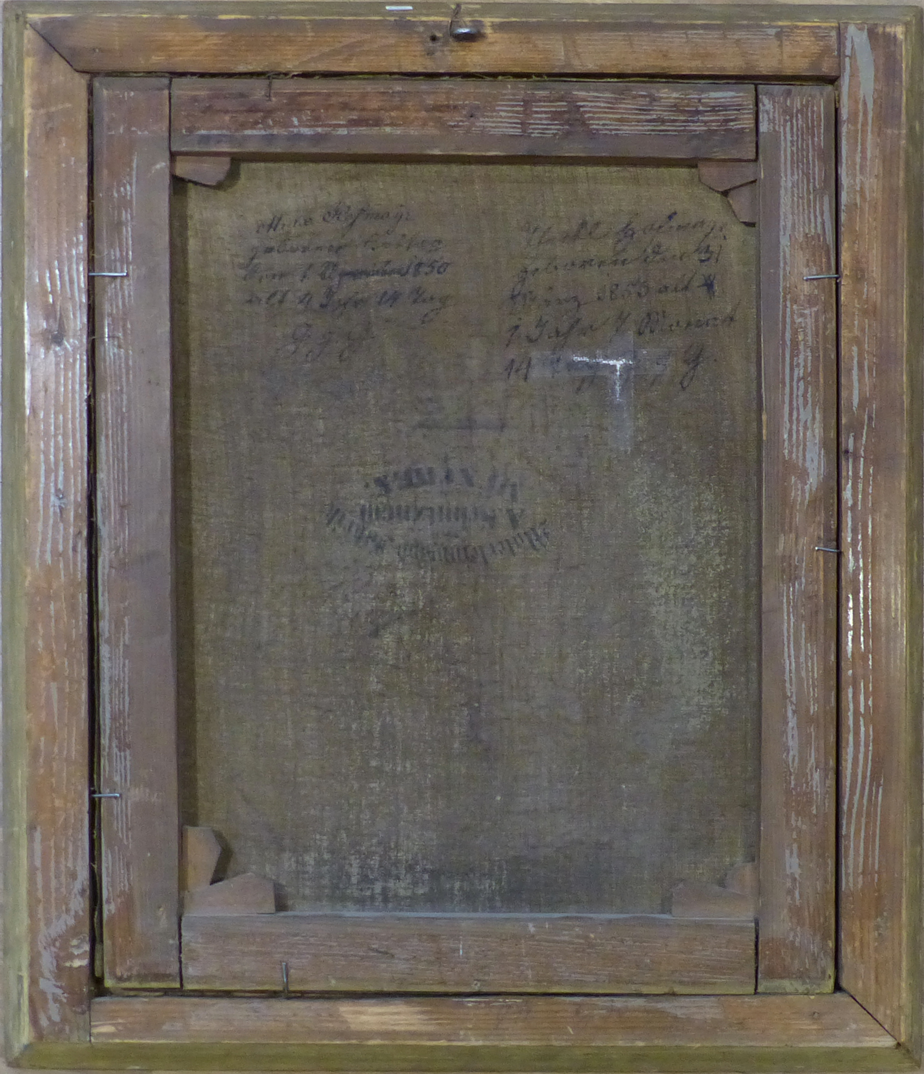 Öl auf Leinwand, dargestellt ist ein sitzendes Geschwisterpaar in zeittypischer Kleidung, unsigniert, rückseitig mehrfach bezeichnet "Max Hofmayr, geboren am Freitag den 1. November 1850, alt 4 Jahr ...Hofmayr, geboren am 31.März 1855, alt 1 Jahr 7 Monat, 14.....", Stempel "Malerleinwand". Maße ca. 42 x 34 cm, profilierte Holzleiste mit Polimentvergoldung ca. 56 x 47 cm. Es zeigen sich moderate Altersspuren, insbesondere Craquelé, kleinere Retuschen, minimale Löcher in der Leinwand, der Rahmen ist leicht berieben und partiell leicht bestoßen. Wohl Ende der 1850er Jahre.