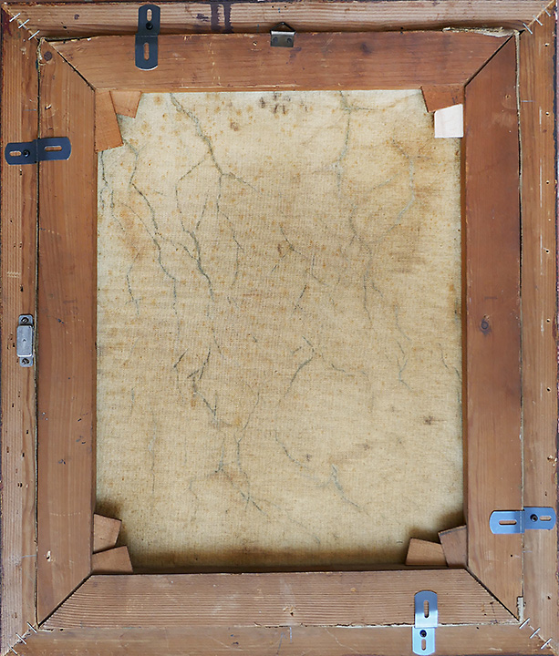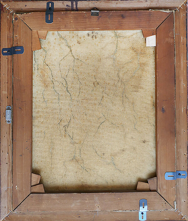 Öl auf Leinwand, rechts unten unleserlich signiert. Bildmaße ca. 50 x 40 cm, Außenmaße der antiken , dunkel-gold gefassten, zweifach gekehlten Holzleiste mit unruhig strukturierter Oberfläche und tlw. dunkler Patinierung (vermutlich aus der Entstehungszeit des Bildes) ca. 58,5 x 49 cm, insgesamt geringe Altersspuren, so zeigen sich Craquelierungen. Das Gemälde wurde professionell gereinigt. Wohl 1920er bis 40er Jahre.