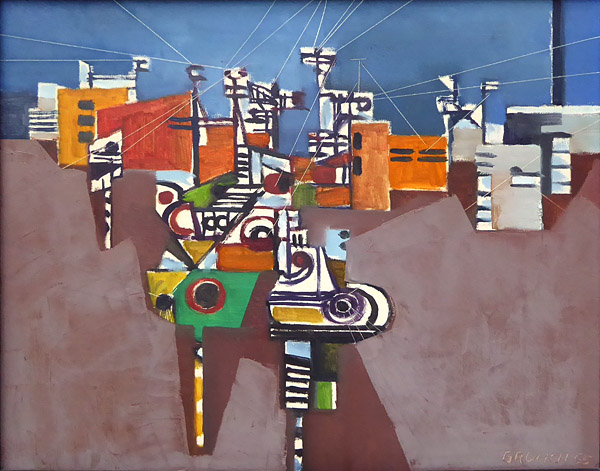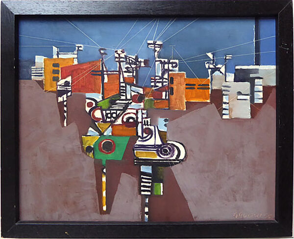 Nach der Übersiedlung nach Düsseldorf 1936 werden daraus vedutenhafte Stadtlandschaften, die ihren Realismus in immer flächiger und abstrakter werdender Manier vortragen. Der über Jahrzehnte als Künstlerverbände leitender und Kunstleben organisierender Lokalmatador Aktive führte die in Düsseldorf tradierte Landschaftsmalerei in die Moderne, blieb aber stets klassischer Maler und Graphiker ohne Avantgardeattitüde. Die Atmosphäre des mit figurinenhaften Personen versehenen Stadtlebens, das sich aus Ruinenstätten zu technisiertem größstädtischem Flair entwickelt, wird mit brutalistischer Architektur, öffentlichen Verkehrsmitteln und Werbeflächen thematisiert. Nie ist es ein rein konstruktivistisches Formspiel, aber die aus düsterem Farbgrund durch aufgehellte Flächen zu gedämpfter Sachlichkeit vereinheitlichten Bilder übersetzen das erlebte Stadtleben in geometrisierte Farbgefüge und tragen so über Jahrzehnte den Geist der Nachkriegszeit in die 90er Jahre. Ein erkennbar eigener Stil zwischen Macke und Dufy schildert in stillen verschachtelten Farbgefügen Düsseldorfs stellvertretenden städtischen Alltag als Zeitgeist, der die technischen Formen der hektisch profanen Verkehrs- und Bauwelt zeitweilig zu roboterhaften Türmungen geometrischer Körper und linearer Strukturen oder zu gestaffelten Raumarrangements schilderartiger und fassadenhafter Modelllandschaften vereinzelt. Auch hierbei bleibt strukutrell der Straßenraum das Thema. Pittura metacityca.