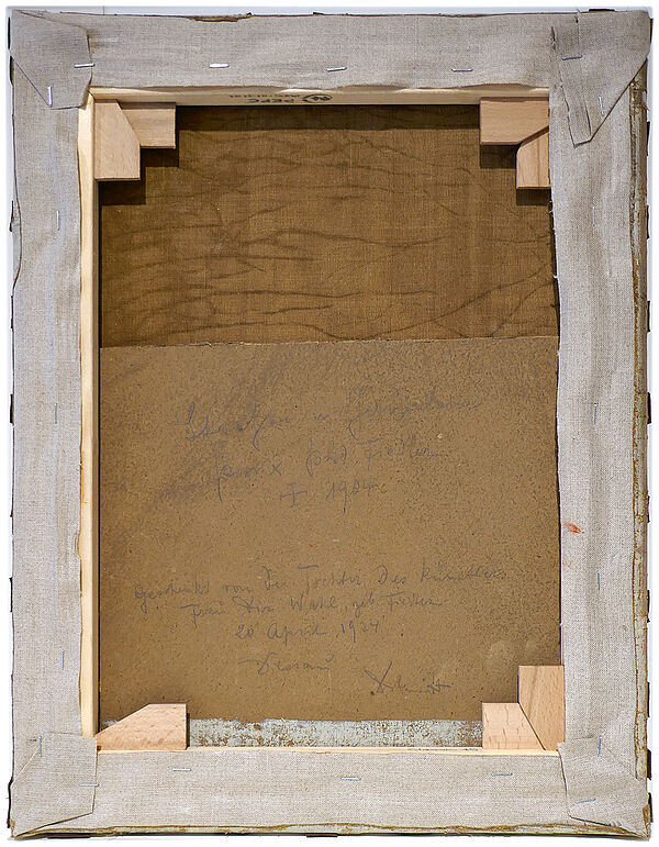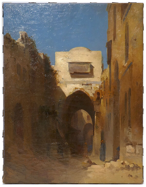 Öl auf Leinwand, Maße ca. 45,5 x 35,5 cm. Unsigniert. Beiliegend Rückseite der alten Rahmung mit handschriftlicher Bezeichnung: “Straße in Jerusalem - pinx. Bhd. Fiedler - + 1904 - Geschenkt von der Tochter des Künstlers Frau …(?) Wahl, geb. Fiedler - 20. April 1924 - Dessau Schmidt". Das Bild wurde professionell gereinigt und neu gefirnisst. Wohl um 1860 bis 1880.