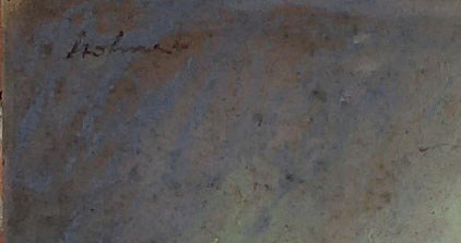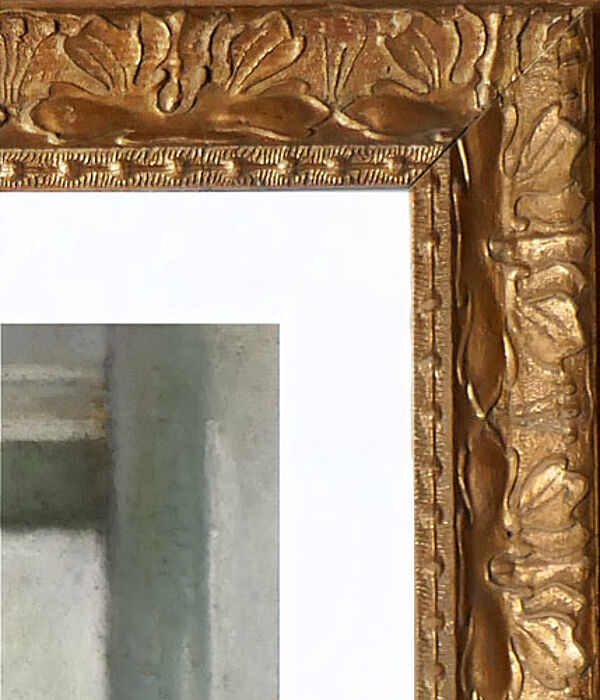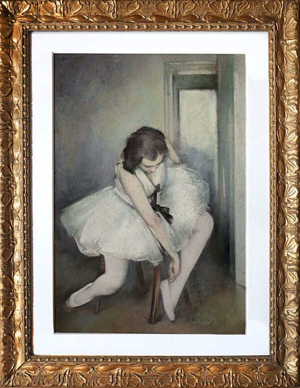 Pastell auf Papier, kaschiert auf dünnem Karton, oben links signiert. Hinter (neuzeitlichem) Passepartout, gerahmt in historischer Leiste mit aufgesetztem, goldgefassten Stuck mit stilisiert-foloralen Jugendstilelementen. Bildmaße ca. 57 x 38 cm, geringe Altersspuren des Blattes, moderate Altersspuren des Rahmens. Wohl um 1915 bis 20.