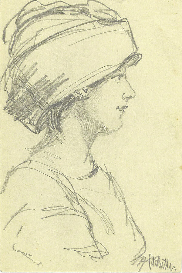 Bleistiftzeichnung auf dünnem, chamoistonigem Postkartenkarton, rechts unten schwer lesbar signiert“….Müller”? (leider ist es uns nicht gelungen, diesen akademischen Maler zu entschlüsseln). Maße ca. 14 x 9 cm, geringe Alters-, Griff- und Lagerspuren. Wohl um 1900.