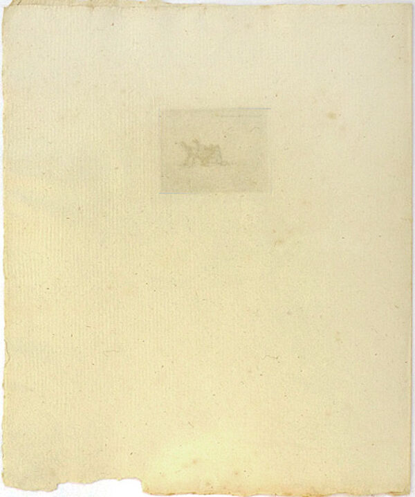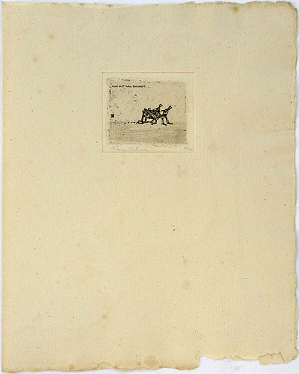 Kleinformatige, brauntonige Radierung auf Bütten (dieses mittig gefaltet: auf der einen Hälfte befindet sich die Darstellung, die andere Hälfte kann man darüber klappen, hier dann passender bzw. integrierter Passepartout-Ausschnitt, wohl vom Künstler selbst geschnitten). Links unterhalb der Darstellung mit Bleistift handsigniert, rechts unten bezeichnet "18/30", in der Platte am linken Rand monogrammiert, am oberen Rand betitelt. Plattenmaße ca. 6 x 4,5 cm, Blattmaße ca. 26 x 21 cm, geringe Alters-, Lager- und Griffspuren, insbesondere zeigen sich am unteren Blattrand kleinere Ausrisse, der Blattrand ist leicht gewellt und vereinzelt (außerhalb der Darstellung) winzige bräunliche Flecke. Wohl 1920er Jahre.