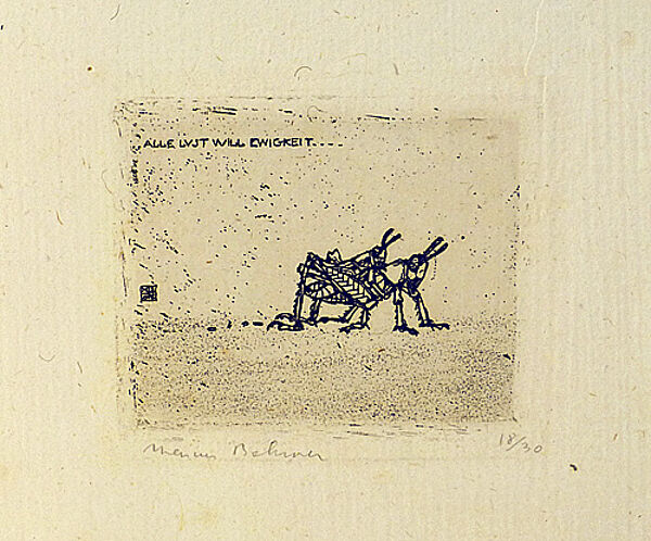 Radierung: Alle Lust will Ewigkeit (zwei kopulierende Heuschrecken)