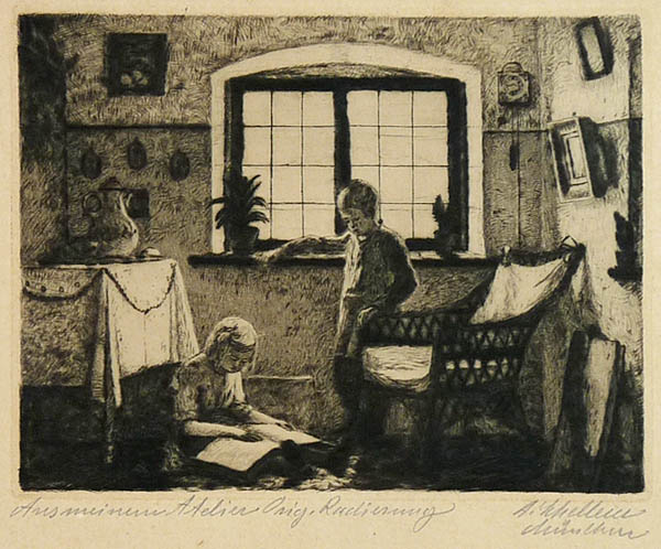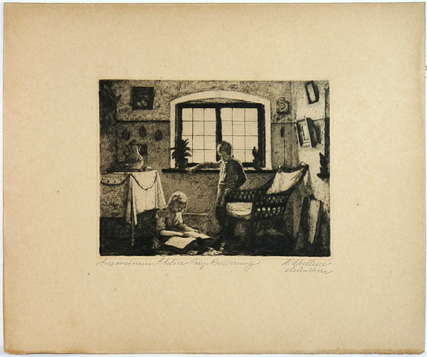 Radierung in Brauntönen auf chamoisefarbenem Papier. Links, unterhalb der Darstellung, mit Bleistift bezeichnet: "Aus meinem Atelier - Orig. Radierung" und rechtsseitig mit Bleistift handsigniert "A. Schellerer / München". Plattenmaße ca. 17,5 x 13,5 cm, Blattmaße ca. 31,6 x 27,7 cm, Papier leicht vergilbt.