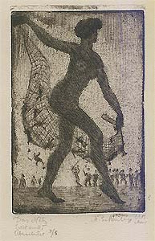 Radierung mit einer Plattengröße von ca. 15 x 9,8 cm Blattmaße ca. 28,5 x 20 cm. Selbstdruck, überarbeitet 3/5, von Hand bezeichnet und signiert, in der Platte datiert Mai 1913. Rückseitig im oberen Bereich kleine Druckfarbenflecke, WVZ Götze A 124.