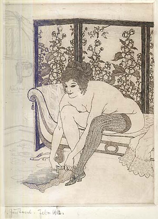 Radierung, 1. Zustand, mit Bleistift überarbeiteter Entwurf. Plattenmaße ca. 22,8 x 17 cm, Blattmaße ca. 29,8 x 20,7 cm, unregelmaßiger schräger re. Blattrand. Unsigniert, datiert Febr. 1912, rückseitig bezeichnet. WVZ Götze A 73.