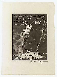 Radierung "Ein gutes Jahr 1938 Kurt, Luise und Doris Gelling" mit den Plattenmaßen ca. 11,8 x 8,8 cm, Blattmaße ca. 18,5 x 13,5 cm, signiert. Nicht im WVZ Götze.