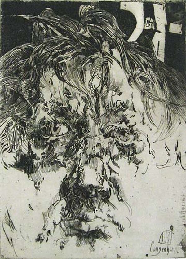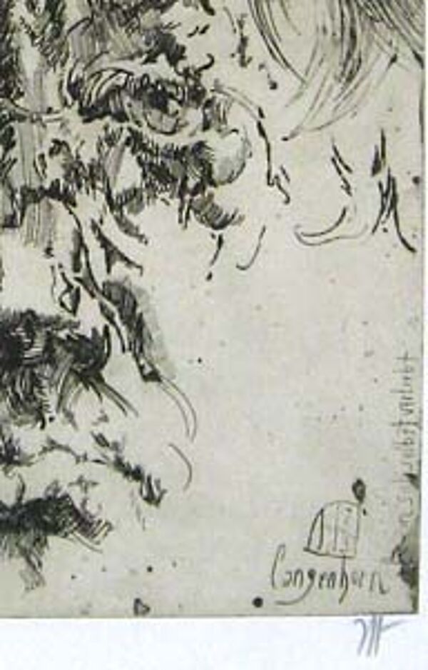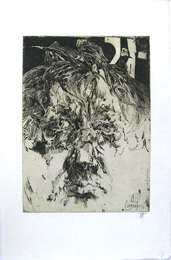 Farbradierung in Schwarzgrün auf dünnem Japanbütten (Edition Griffelkunst von 1983) mit den Plattenmaßen von ca. 29,5 x 21 cm und den Blattmaßen von ca. 44 x 28 cm. In der Darstellung bezeichnet "Langenhorn" und "in sich selbst verliebt". Kruglewsky 73. Rechts unten mit Bleistift handsigniert. Minimale Griff- und Lagerspuren.