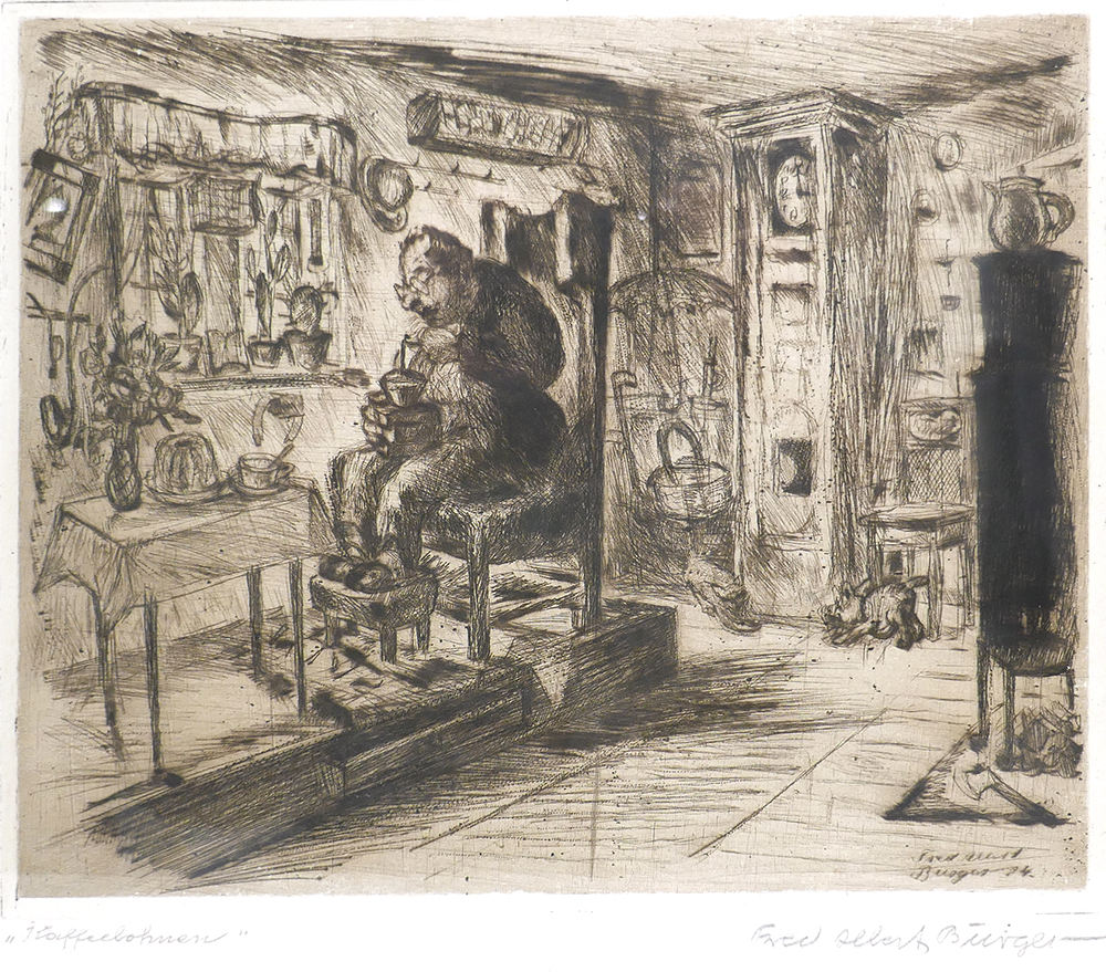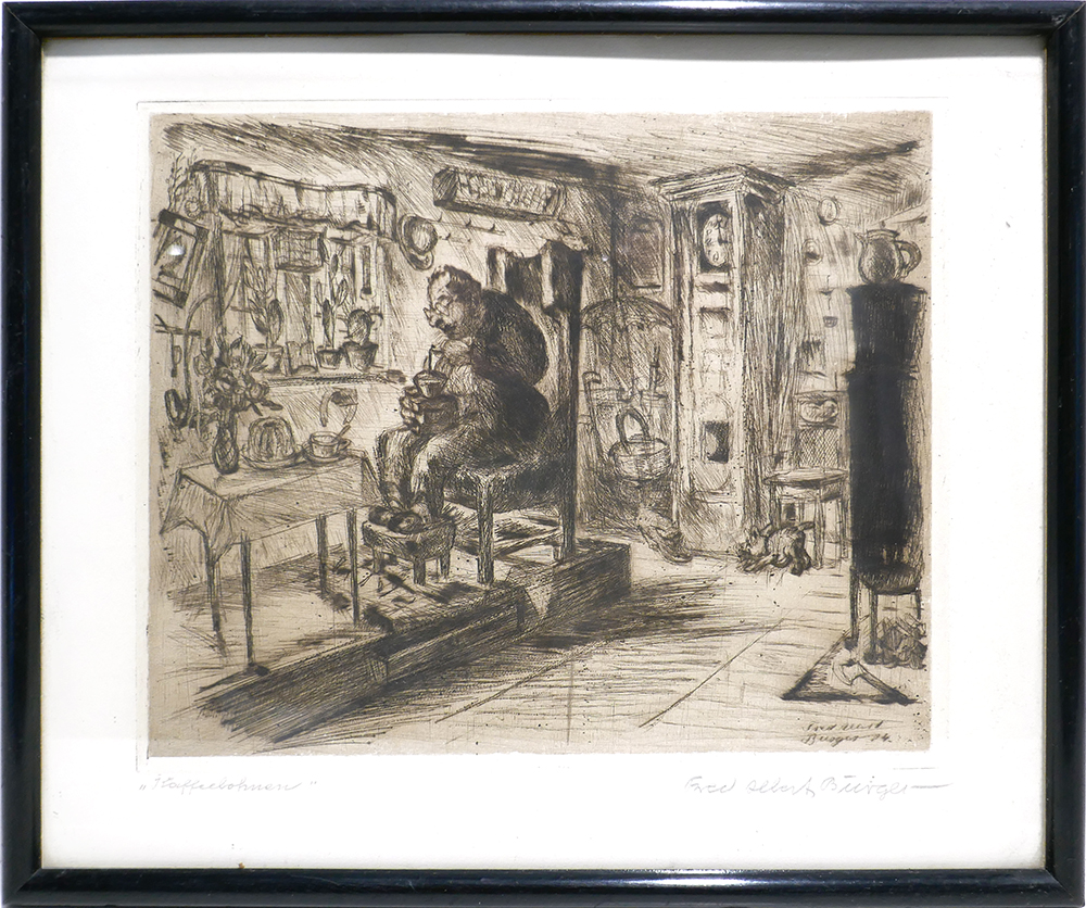 Brauntonige Radierung - humoristische Darstellung eines in einem Ohrensessel sitzenden, älteren Herren, der versonnen mit einer Kaffeemühle Kaffeebohnen mahlt, dies in einem “spitzweg-artigen” Interieur. Unter der Darstellung mit Bleistift handsigniert, links betitelt, in der Platte rechts unten nochmals signiert und datiert (19)"24". Außenmaße der vermutlich originalen, schmalen, einfach gewölbten, schwarz gefassten Holzleiste ca. 26,5 x 30 cm (ungeöffnet), Bild- bzw. Plattenmaße ca. 19,8 x 22,6 cm, der Rahmen mit geringen Altersspuren.