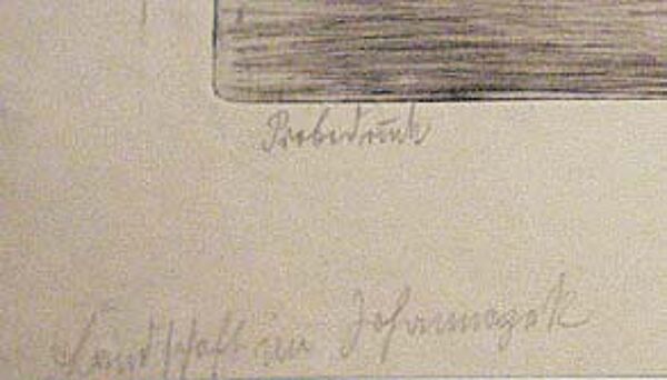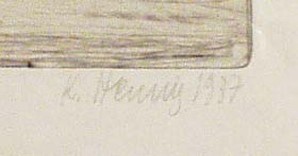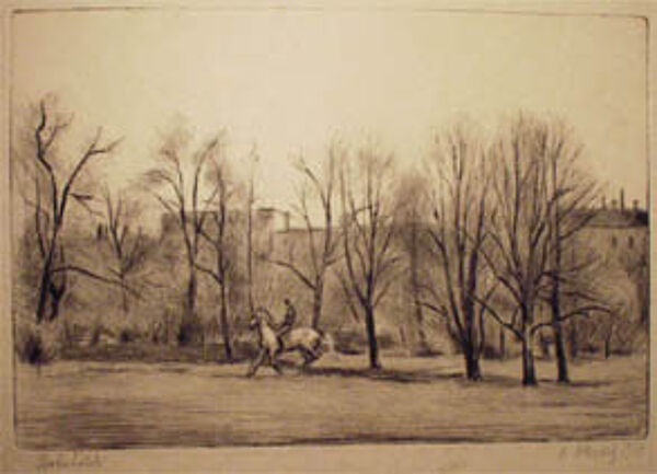 Radierung auf chamois-tonigem Papier mit den Maßen ca. 35 x 25 cm (auf Unterlage montiert), rechts unterhalb der Darstellung mit Bleistift handsigniert und datiert "1937", links bezeichnet "Probedruck" sowie weiter unten "Landschaft im Johannespark". Geringe Alters-, Griff- und Lagerspuren.