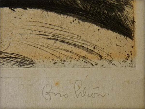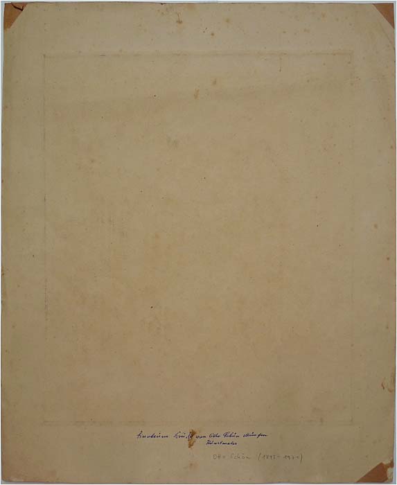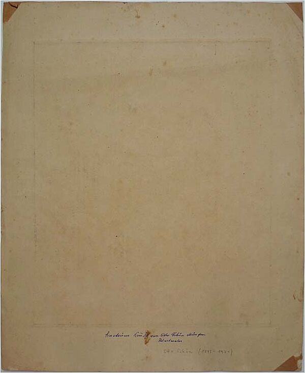 Radierung auf kräftigem Papier. Rechts unten signiert, rückseitig (von fremder Hand?) bezeichnet: "Linoleum Druck von Otto Schön München Kunstmaler". Plattengröße ca. 34,5 x 29 cm, Blattgröße ca. 44,8 x 36,6 cm. Das Papier ist im Passepartout-Ausschnitt leicht gebräunt, insbesondere am Rand, außerhalb der Darstellung, finden sich einige kleine Stockflecke sowie leichte bis moderate Griff-, Schmutz- und Knickspuren, rückseitig an den Ecken Reste alter Montierung. Wohl zwischen 1915 und 25.