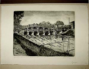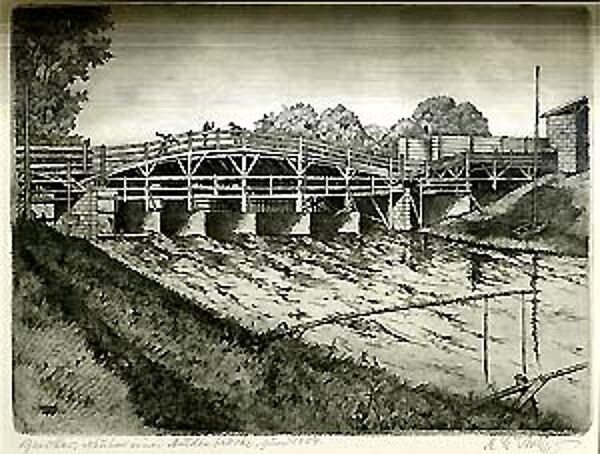 Radierung: Zwickau, Neubau einer Muldenbrücke