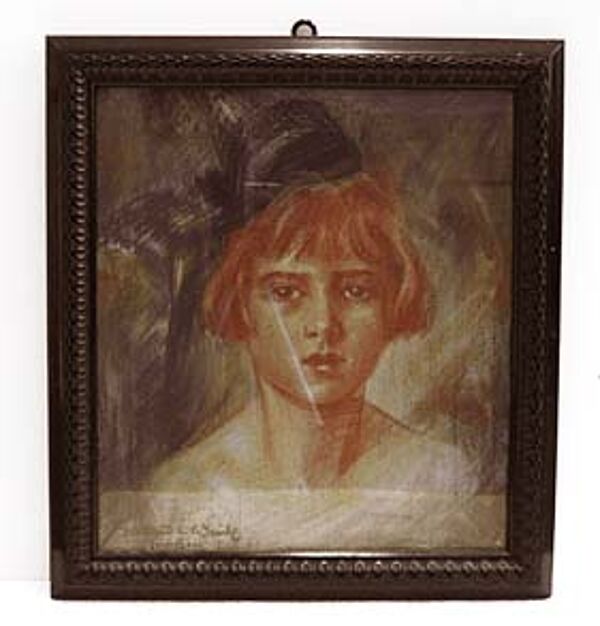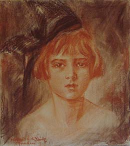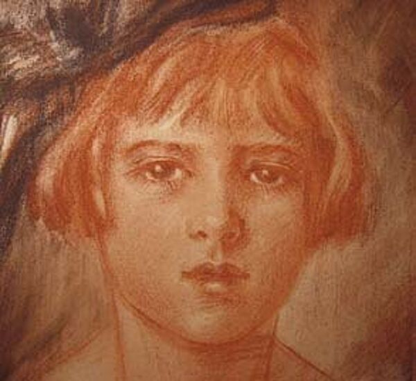 Rötelzeichnung: ohne Titel (Portraitstudie eines jungen Mädchens mit Hut)