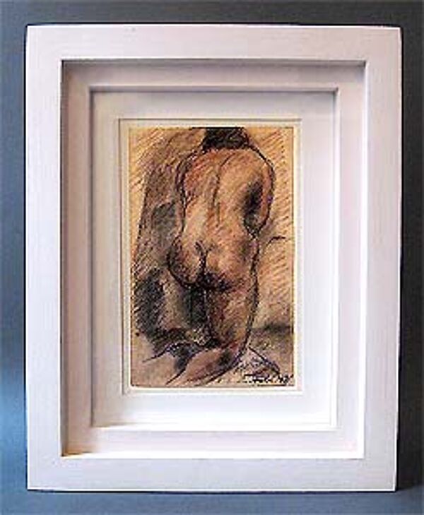 Rötelzeichnung mit den Maßen ca. 22 x 13,51 cm, rechts unten signiert und datiert: Febr. (19)49. Rahmung mit einer neuen, weißen, einfachen, getreppt aufgebauten Holzleiste, Maße ca. 37, 5 x 30 cm.