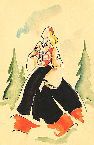 Aquarellierte Federzeichnung der Art-deco-Zeit: ohne Titel (Junge Frau in Tracht im Wald)