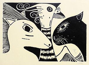 Farbiger Linolschnitt: ohne Titel ("Stilleben auf Tisch")