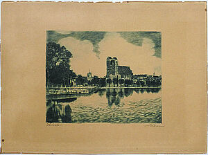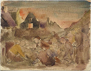 Aquarellierte Federzeichnung: ohne Titel (Menschen in Ruinen)