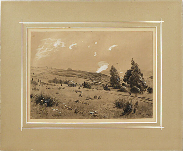 Sepiazeichnung: ohne Titel (hügelige Landschaft mit Pferdewagen)