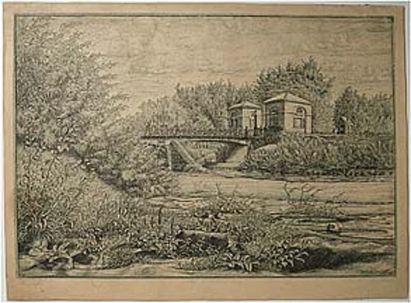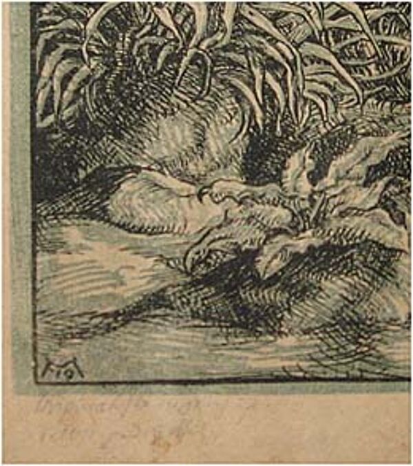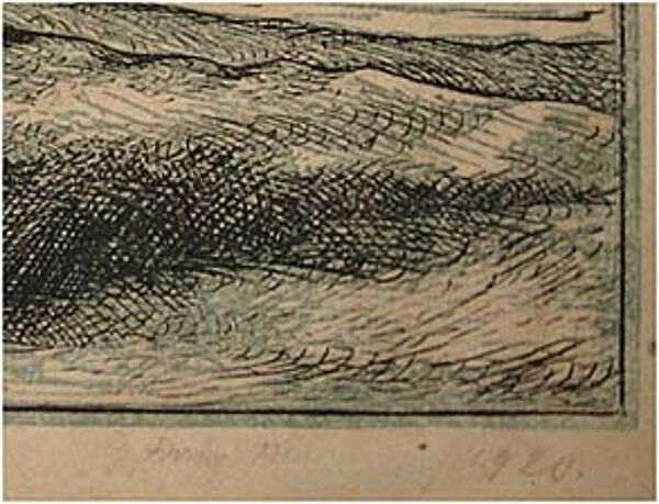 Detaillierte, fein ausgeführte Steinzeichnung in schwarz und grün, Blattgröße ca. 39 x 28,5 cm. Papier mit leichten Griffspuren, am unteren und linken Rand sind kleine, hinterklebte Einrisse sowie an der linken Ecke eine leichte Knickspur und ein kleiner Wasserfleck zu erkennen, rückwärtig Reste alter Montierung. Untem mittig im Stein bezeichnet "Dessau die Muldbrückenhäuser", links unten im Stein monogrammiert und datiert (19)19, links unten mit Bleistift bezeichnet "Originalsteinzeichnung selbst gedruckt" und rechts unten mit Bleistift signiert und nochmals datiert (allerdings hier mit 1920, also das Jahr des Druckes).