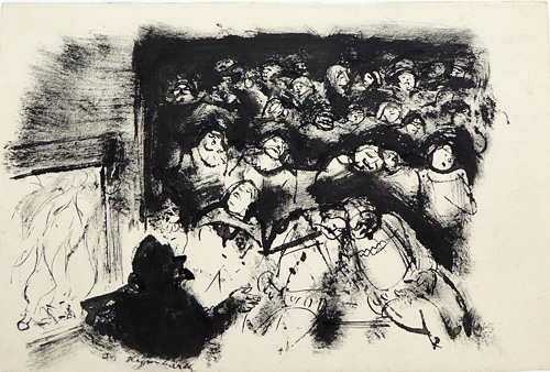 Tuschezeichnung: Illustration zu "Die Schildbürger" (wie die Lalen am Kaminfeuer allesamt einschlafen und schnarchen)