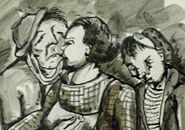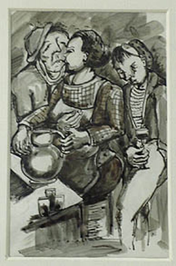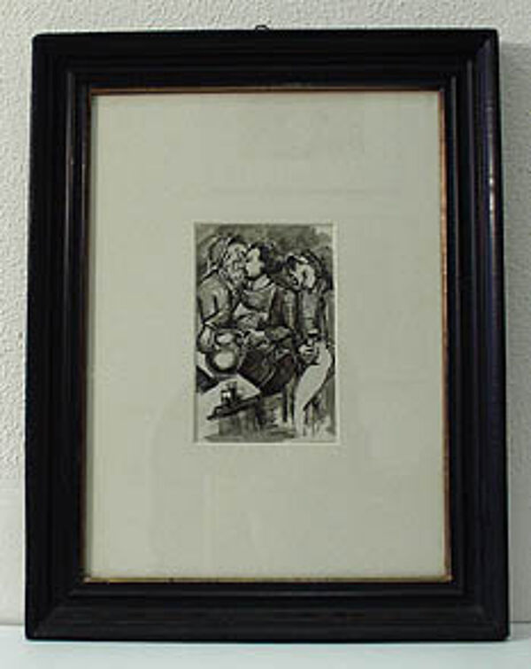 Recht expressive Wirtshausszene, lavierte Tuschzeichnung. Mit Passepartout und profiliertem Holzrahmen (Innenkante vergoldet). Passepartoutausschnitt 16,3 x 10,6 cm, Rahmenmaße 46 x 36 cm, Rahmenbreite ca. 5 cm (im Preis inbegriffen). Auf Passepartout signiert: Grete Kratz Hanow, wohl 1920er/30er Jahre.