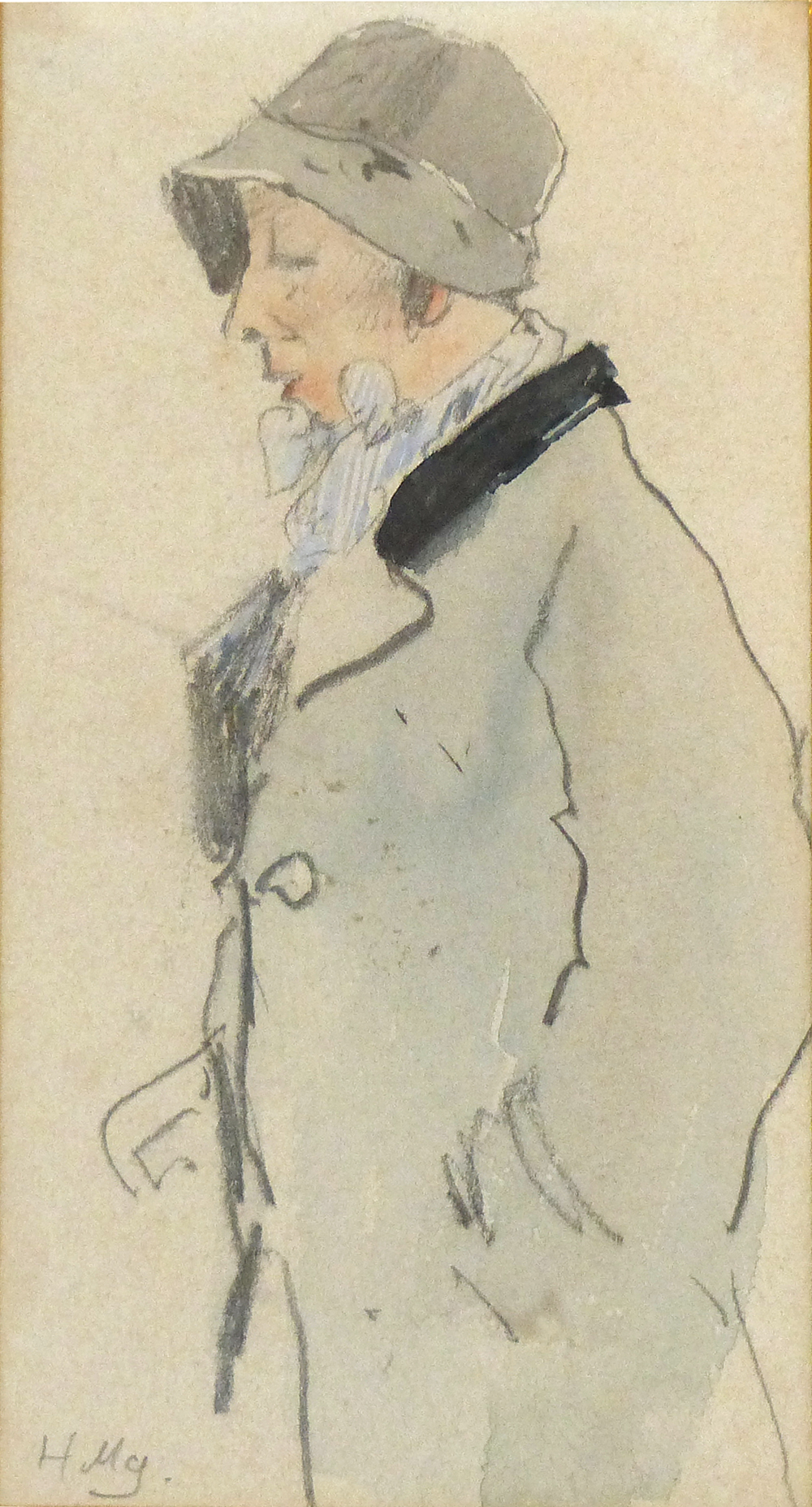 Aquarellierte Bleistiftzeichnung auf Papier. Dargestellt ist eine Dame in Mantel und mit Hut, links unten mit Bleistift handsigniert. Außenmaße der älteren, einfachen, vergoldeten Holzleiste ca. 27 x 20 cm, Sichtmaße (Passepartoutausschnitt) ca. 14,5 x 7,7 cm, geringe Altersspuren. Wohl 1920er Jahre.