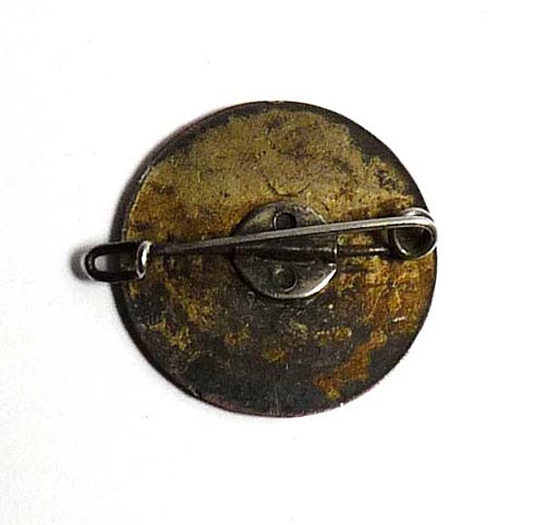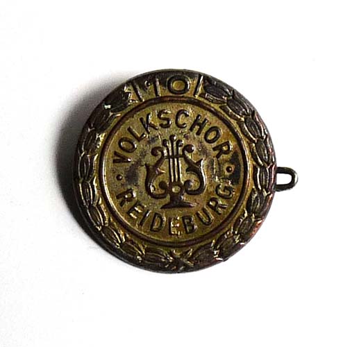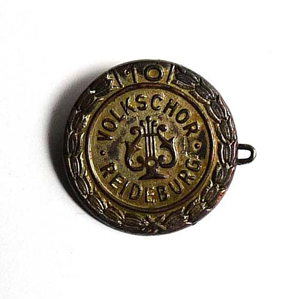 Runder Anstecker zum 10-jährigen Jubiläum des Chors aus dem Jahre 1956. Vorderseitig Lyra sowie Bezeichnung "Volkschor Reideburg", im abgesetzten Randbereich stilisierter Lorbeerkranz und "10". Durchmesser ca. 2,3 cm, Oxydations- und Bereibungsspuren. Rückseitig einfache Nadelung.