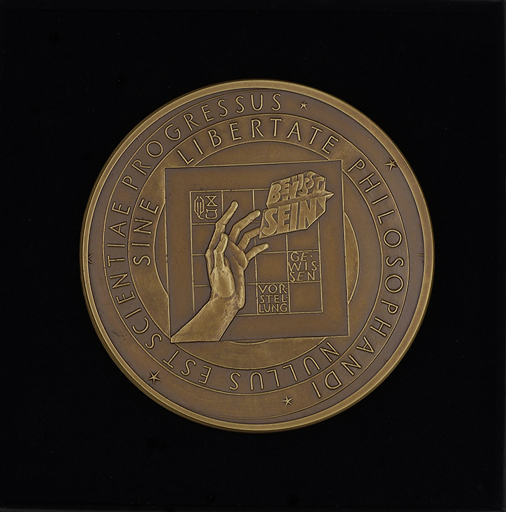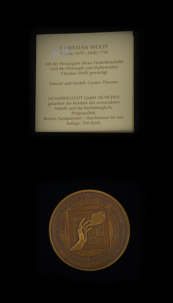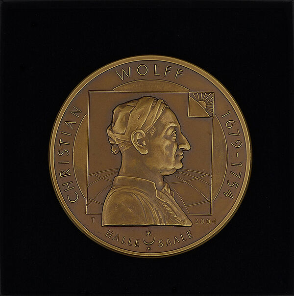 Überwiegend hellbraun patinierte Bronzemedaille auf den 250. Todestag von Christian Wolff. Vorderseite: Brustbild von Wolff im Profil nach rechts, im Randbereich bezeichnet "CHRISTIAN WOLFF" und "1679 - 1754". Rückseite: Symbolisierte Denkfreiheit. Durchmesser ca. 60,6 mm, minimale Altersspuren. Auflagenhöhe: 200 Exemplare (DGMK 23 S. 293, Nr. 7 NNB 1/2005 S. 8).