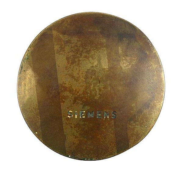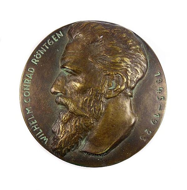 Einseitige Bronzemedaille mit hochreliefiertem Portrait (Kopf seitlich nach links) und vertiefter Bezeichnung am Rand "Wilhelm Conrad Röntgen" bzw. "1845 - 1923". Unterhalb des Reliefs signiert. Rückseitig Bezeichnung "SIEMENS". Durchmesser ca. 11,3 cm, vorderseitig fast gleichmäßige, relativ warme, rückseitig etwas fleckige Patina. In den Vertiefungen der Schrift z.T. helle Rückstände alter Putztmittel, leichte Griffspuren. Wohl Mitte / Ende 20er Jahre.