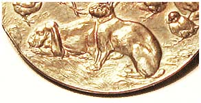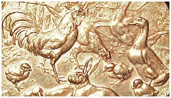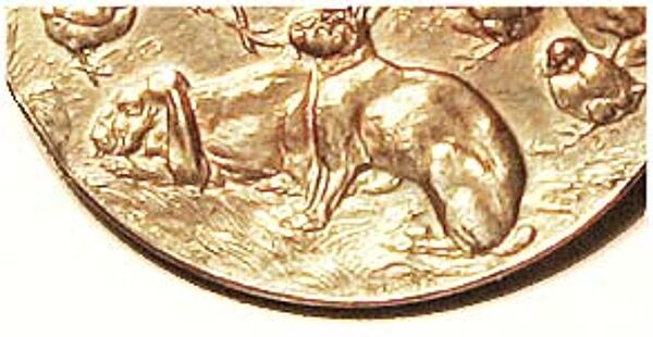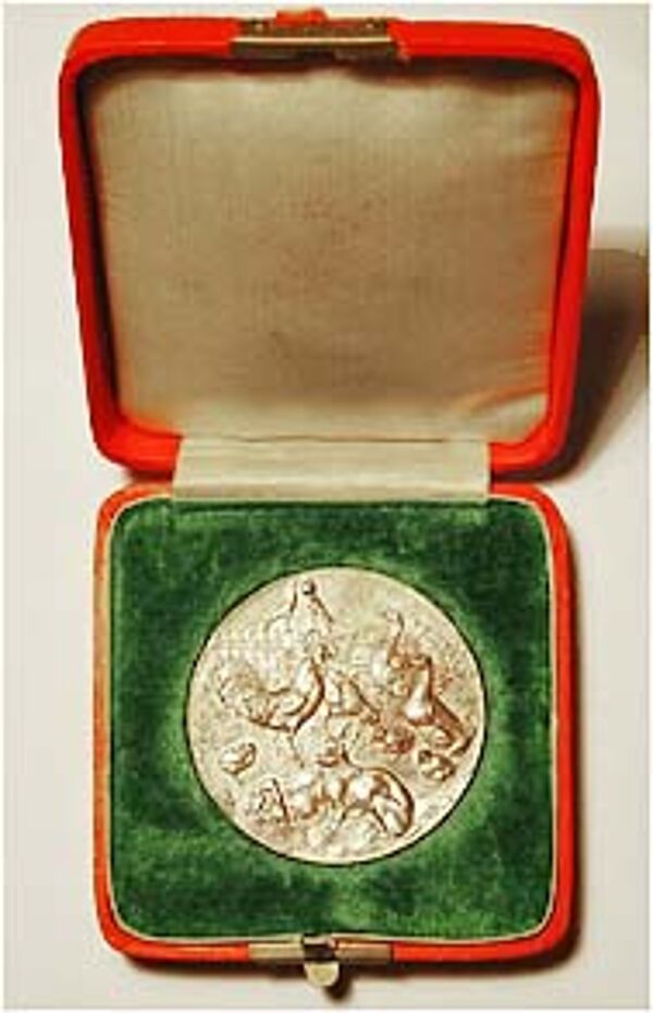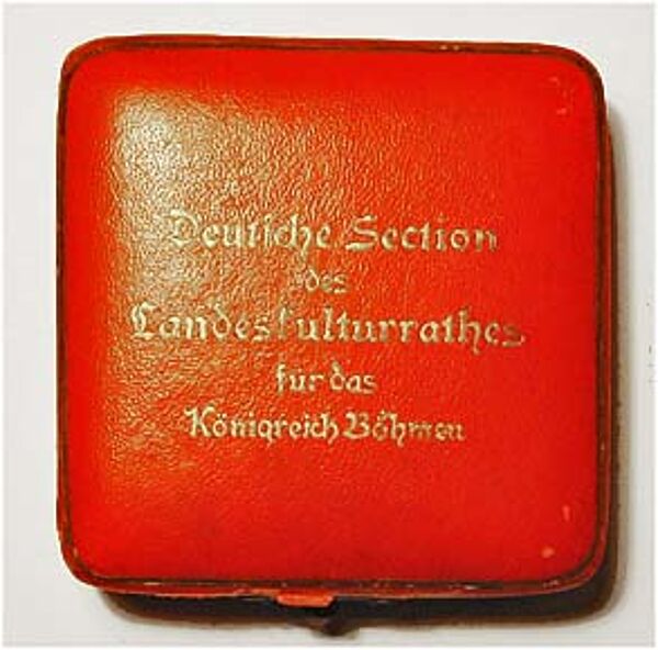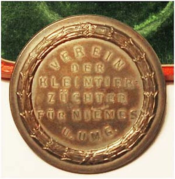 Bronze-Medaille mit vorderseitigiger Darstellung mehrerer Haustiere, meist Federvieh im eingezäumten Hof, im Randbereich bezeichnet "Deschler u. Sohn" (Hersteller). Rückseitig zentral bezeichnet: "VEREIN DER KLEINTIERZÜCHTER FÜR NIEMES U. UMG.", im Randbereich Blätterkranz (Lorbber?). Vorhanden ist auch noch die originale, rote, etwas bestoßene, scharnierte Schachtel mit Schnappschloss u. Aufschrift: "Deutsche Section des Landeskulturrathes für das Königreich Böhmen". Durchmesser ca. 4,5 cm, minimale Gebrauchsspuren bei leichter Patina bzw. ungeputztem Zustand. Maße der Schachtel: ca. 7,5 x 7,5 x 2 cm. Entwurf wohl Deutschland um 1900 bis 15.