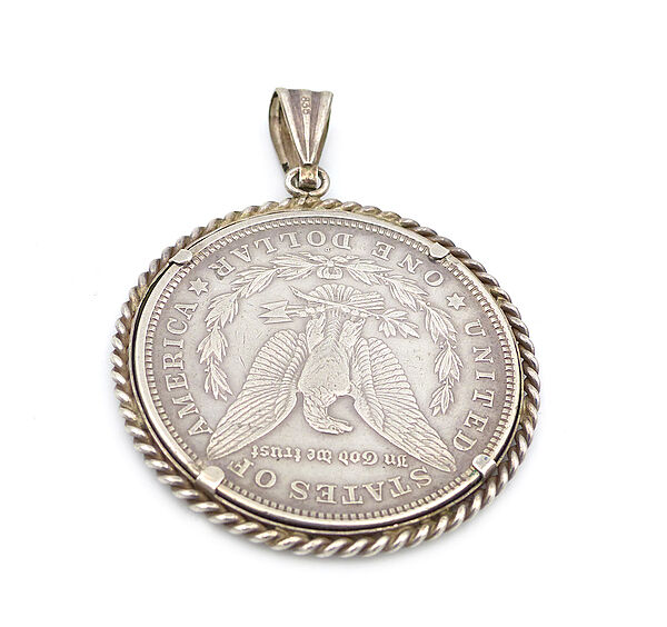 Die Silberfassung (835er) hat die Form einer Kordel, oberseitig befindet sich eine schlank-dreieckig konfigurierte, bewegliche Aufhängung. Bei der Münze handelt um eine der bekanntesten der Welt, die silberne 1-Dollar-Münze, die nach dem Graveur George T. Morgan benannt (sog. “Morgan-Dollar”), 1876 entworfen und bis 1921 herausgegeben wurde, also dem Jahr, aus dem unsere Münze stammt. Er wurde in Denver geprägt (Prägebuchstabe “D” am rückseitigen Unterrand). Der untere Federkranz des Adlers besteht aus 6 Federn. Die Vorderseite zeigt die an griechische Vorbilder angelehnte Kopfansicht der Freiheitsgöttin nach links (Vorbild im engeren Sinne soll die Frau des Künstlers gewesen sein), am Halsansatz mit “M” monogrammiert, am Rand umlaufend bezeichnet “ E PLURIBUS UNUM”. Die Rückseite zeigt das Wappentier der Vereinigten Staaten, den Weißkopfseeadler, der einen Olivenzweig und ein Bündel Pfeile in seinen Krallen hält. Entlang des Randes umlaufender Schriftzug “UNITED STATES OF AMERIKA” und der Nennwert “ONE DOLLAR” sowie oben mittig der Slogan “In God we trust”. Durchmesser 4,5 cm, die Münze weist leichte Gebrauchs- und die Fassung moderate Tragespuren auf, ungeputzter Zustand mit geringer Patina.