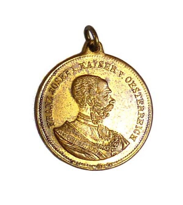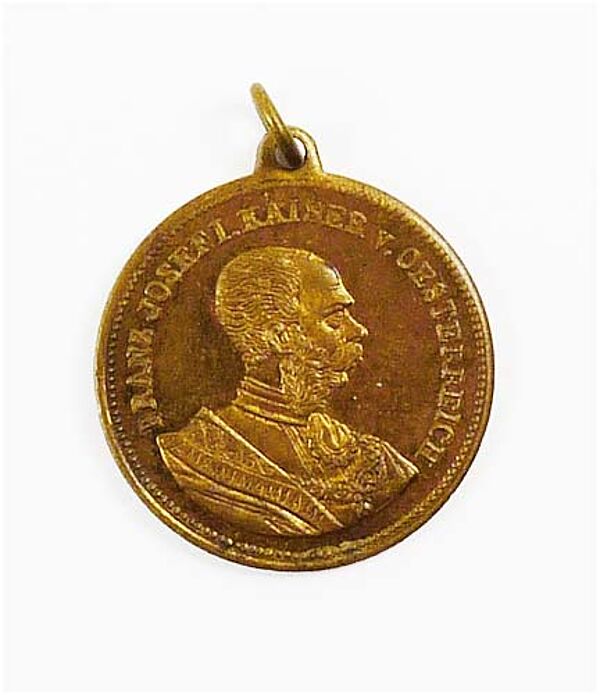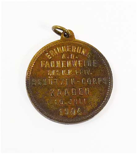 Bronze- oder Messingkorpus mit Anhängeröse, Vorderseite: Kopf von Kaiser Franz Josef nach rechts, im Randbereich bezeichnet "FRANZ JOSEF I. KAISER V. OESTERREICH"; Rückseite: hier bezeichnet "ERINNERUNG A. D. FAHNENWEIHE DES K. K. PRIV. SCHÜTZEN - CORPS KAADEN 10. JULI 1904"; ungeputzter Zustand mit rückseitig etwas ungleichmäßiger Patina und geringen Griffspuren.
