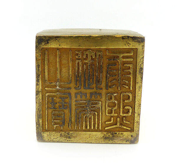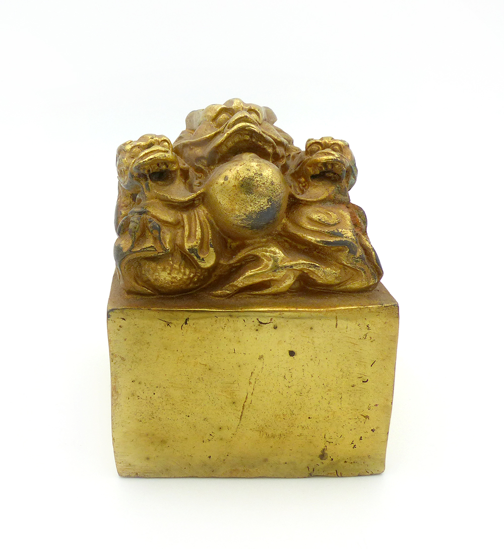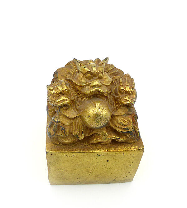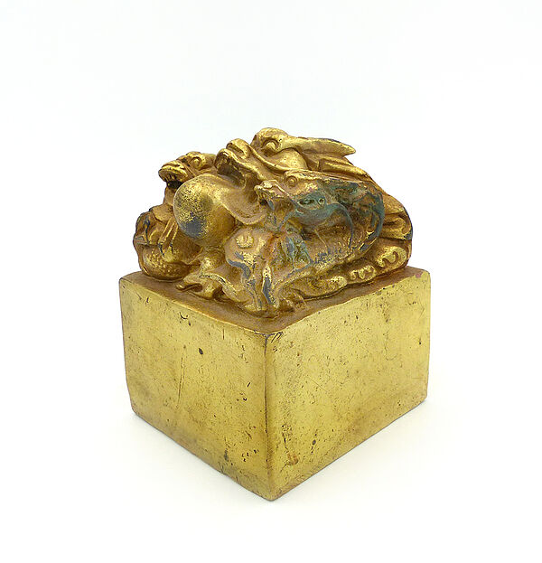 Korpus aus vergoldeter Bronze - auf einem Kubus ruht ein vollplastisch ausgearbeiteter, stilisierter, dreiköpfiger Drache, unterseitig Stempelfläche mit Sechs-Zeichen-Marken der Ming-Dynastie. Höhe ca. 9 cm, geringe bis allenfalls moderate Altersspuren, insbesondere zeigen sich vereinzelte Bereibungen der Vergoldung und stellenweise eine dunkle Patina der darunter liegenden Bronze. Ming-Dynastie, wohl Ende des 19. Jahrhunderts.