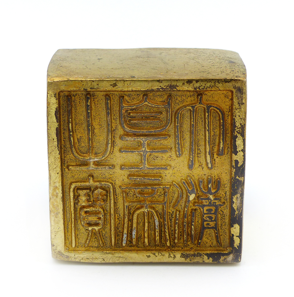 Korpus aus vergoldeter Bronze - auf einem Kubus ruht ein vollplastisch ausgearbeiteter, stilisierter, geflügelter Löwe (auch Pixiu genannt, einem Wesen der chinesischen Mythologie, welches böse Geister vertreiben soll), unterseitig Stempelfläche mit Sechs-Zeichen-Marken der Ming-Dynastie. Höhe ca.7,5 cm, geringe Altersspuren, insbesondere zeigen sich vereinzelte Bereibungen der Vergoldung und stellenweise eine dunkle Patina der darunter liegenden Bronze. Ming-Dynastie, wohl Ende des 19. Jahrhunderts.