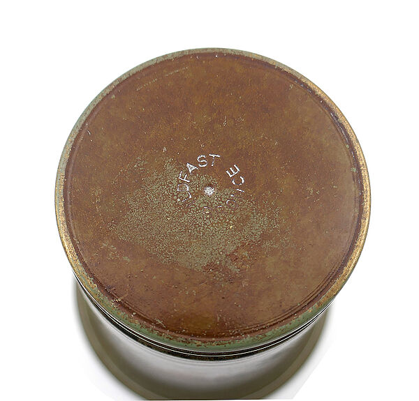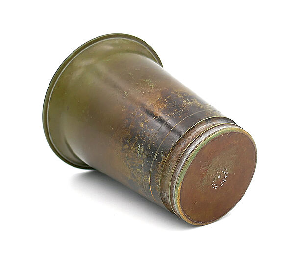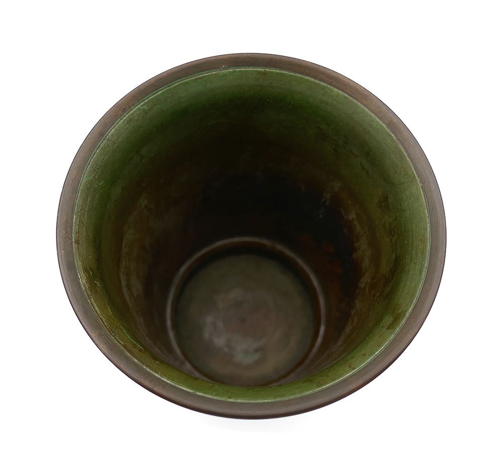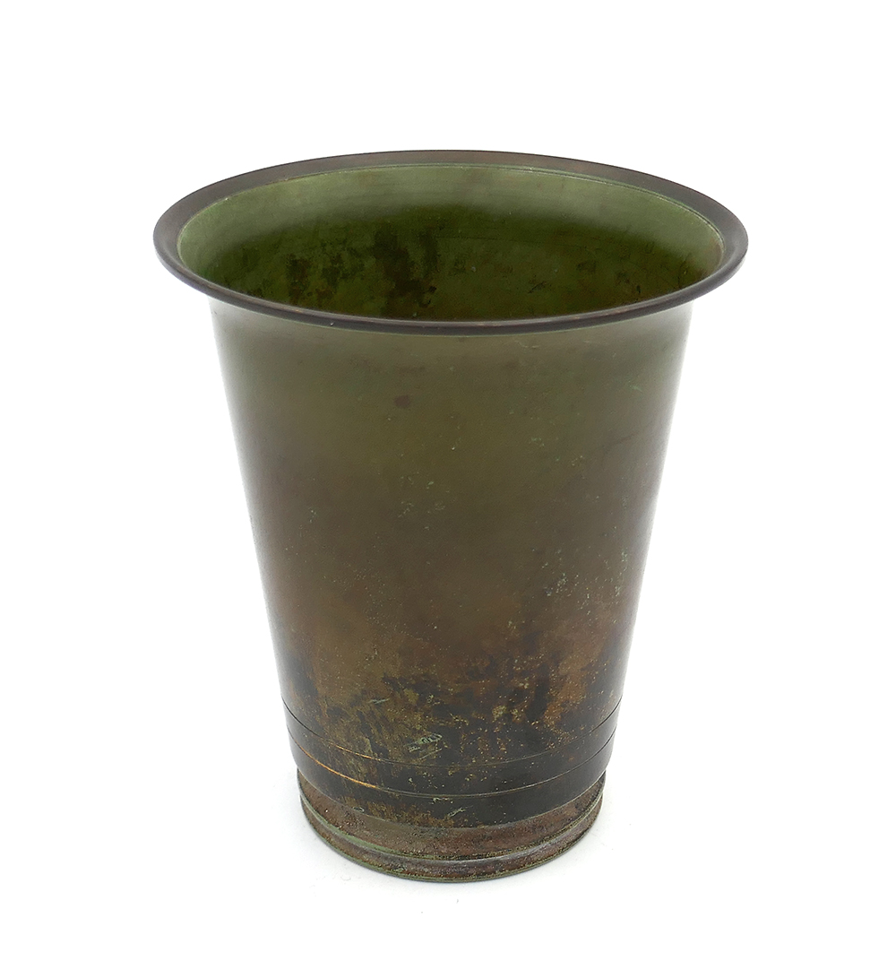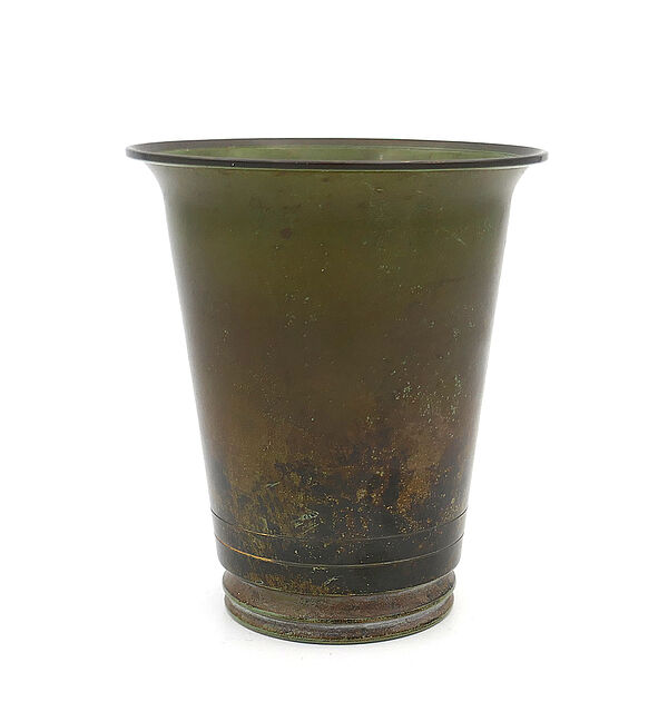 Becherartiger Korpus mit leicht ausgestellten Rand aus dünnwandiger, grünlich patinierter Bronze, der sich zum Stand allmählich verjüngt, der Fußbereich ist durch zwei zarte Rillen und zwei schmale Vertiefungen abgesetzt. Unterseitig gemarkt und bezeichnet “Bronce”, Höhe ca. 10 cm, moderate Alters- bzw. Gebrauchsspuren, insbsondere ungleichmäßige Patina. Wohl 1920er bis 40er Jahre.