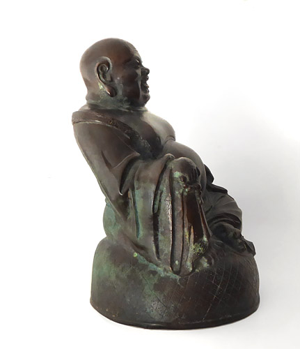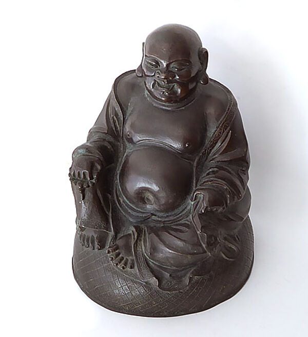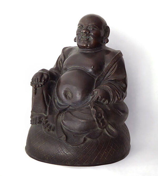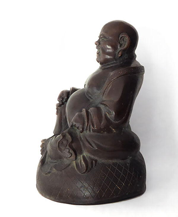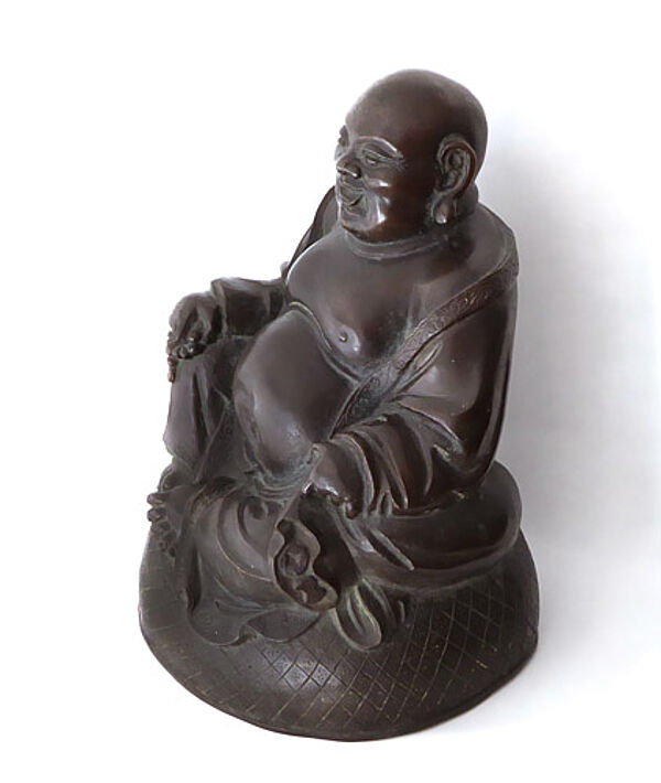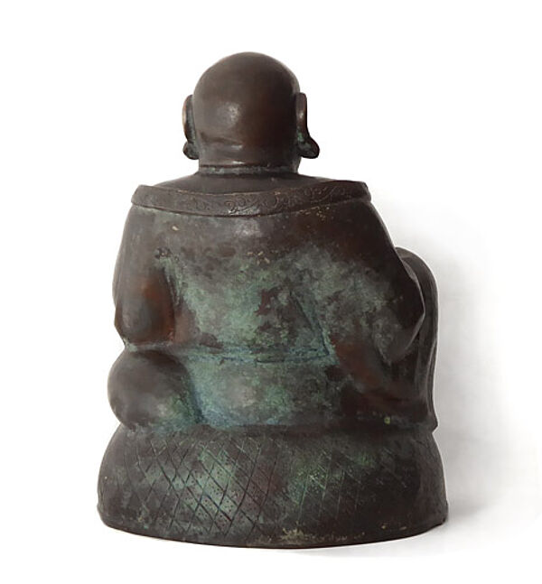 Bronzekorpus mit schwarzbrauner alter Patina, z.T. rückseits auch grünliche. "Der beliebte Wahrsager und Mönch lebte im 10. Jh. und gilt auch als Inkarnation des Buddhas der Zukunft Maitreya. In dieser Darstellung ist er ikonographisch genau ausgeführt, er sitzt behäbig auf seinem Sack, der ihm den Namen gegeben hat (Budai bedeutet Kattunsack). Sein stattlicher Bauch ist entblößt, ein Bein hat er angezogen und hält auf ihm mit der Hand eine Gebetsschnur. Gut geschnittene Gewandfalten. Sein Gesicht zeigt sehr selbstbewußte, vergnügte Züge.