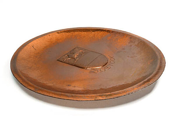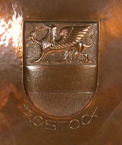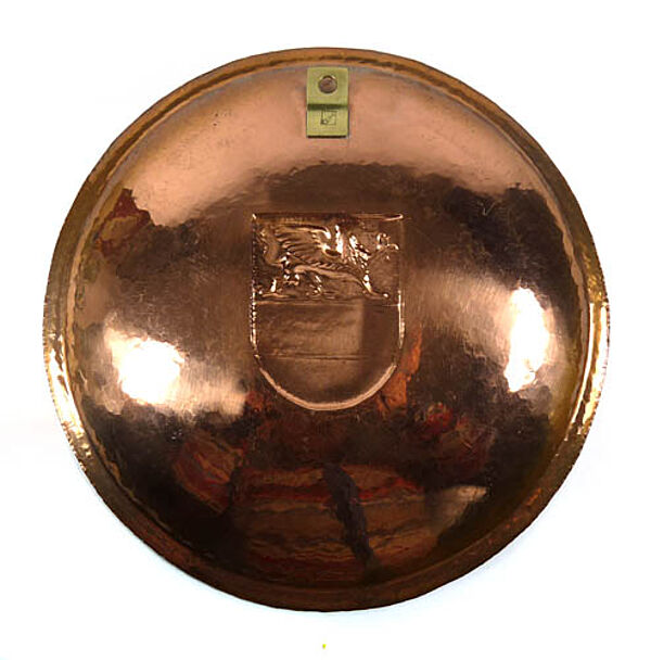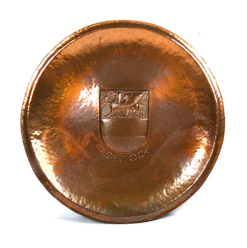 Handgetriebener, flach schalenförmiger Kupferkorpus mit leicht ausgestelltem, schmalen Rand und gleichmäßigem Hammerschlagdekor, mittig leicht erhabenes, flach reliefiertes, fein getriebenes und punziertes Wappen von Rostock, darunter gepunzte Bezeichnung “ROSTOCK”. Durchmesser ca. 27,7 cm, Höhe ca. 2,1 cm, ungeputzter Zustand mit etwas ungleichmäßiger, vereinzelt fleckförmiger Patina, ansonsten nur minimale Altersspuren. Rückseitig angelöteter Aufhängevorrichtung in Form einer kleinen, hochrechtigen, im oberen Drittel gelochten Messingplatte, hier auch Markung (stiisierter Fisch). Wohl 1960er, 70er Jahre.